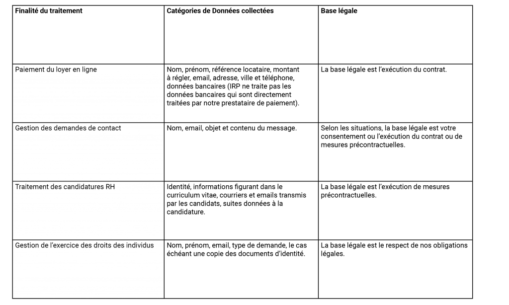 IRP agit en qualité de Responsable de traitement pour le traitement de vos Données.