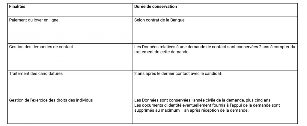 Vos Données sont conservées pour les durées suivantes :
